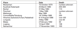 As soon as armed clashes began, GoB militarised the region by deploying 115,000 military personnel – one soldier for five to six hill persons (Levene 1999: 354). In the 1980s, the CHT was, effectively, turned into a large military garrison. As a result of this militarisation of the region, attack on indigenous villages and detention, torture, disappearance and killing of the Hill People became almost routine occurrences. From the late 1970s onward, the armed forces also started massacre as a policy instrument. On 15 October 1979, government forces massacred unarmed villagers in Mubachari, the first large scale killing in the CHT (Samad 1980), and Amnesty International reported more such massacres in the subsequent years committed jointly by the military and the Bengali settlers (Amnesty International 1986). The Kaukhali massacre on 25 March 1980 (ironically it was on this day that Pakistani forces had first attacked unarmed Bengalis in 1) surpassed, according to Chittagong University academic Hayat Hossein (1986), “all previous records of brutalities” committed against indigenous people. This was confirmed by fact-finding team of Upendra Lal Chakma, Shahjahan Siraj, and Rashed Khan Menon. The consistent pattern of these massacres in